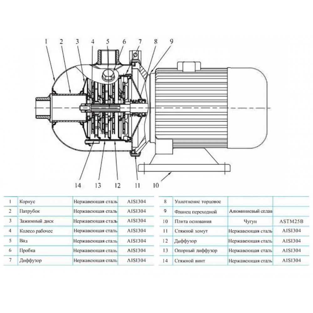 - Рабочие колеса и диффузоры: нержавеющая сталь AISI 304. Рабочие колеса изготовлены методами штамповки и сварки из листовой нержавеющей стали и установлены на удлиненном валу электродвигателя консольно.