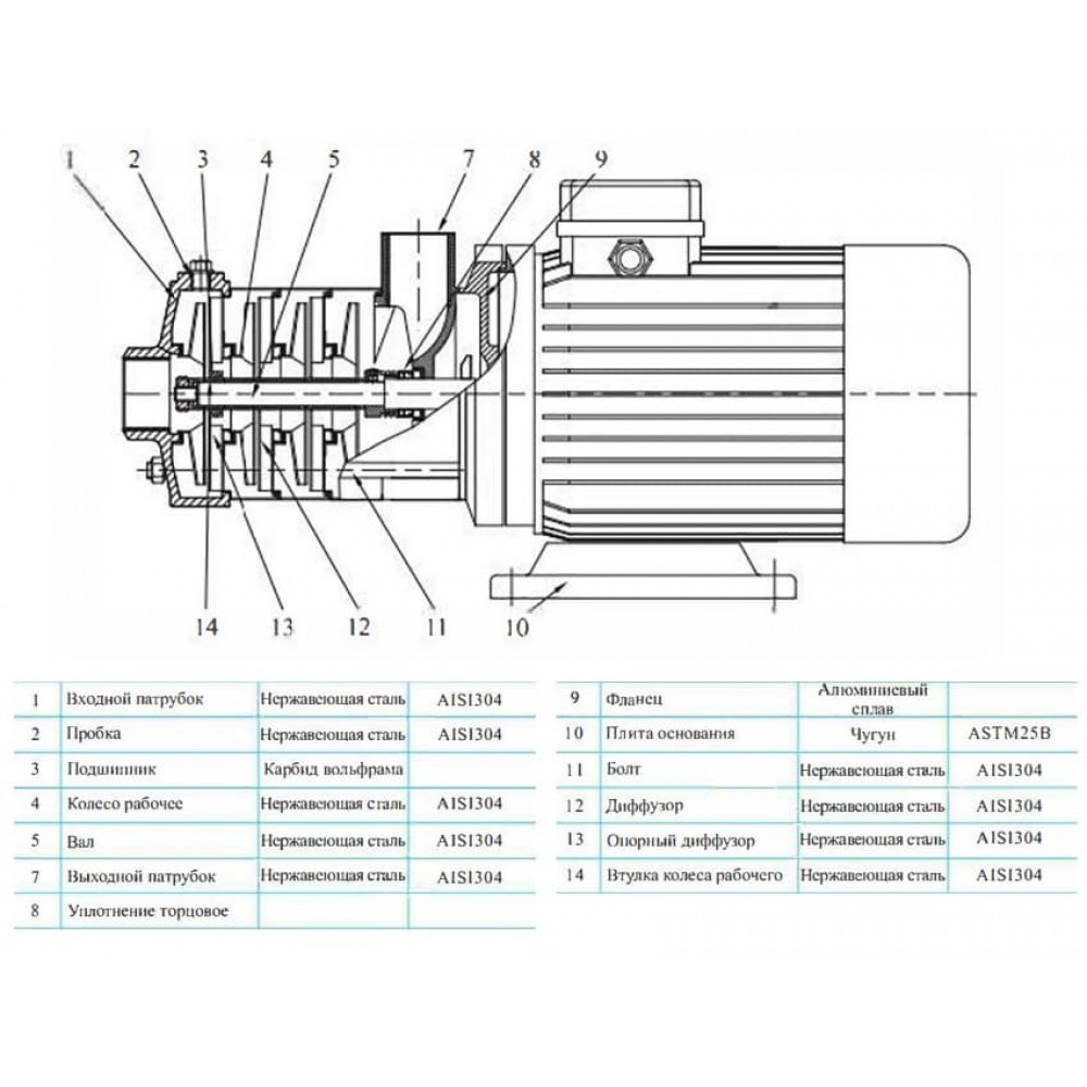 - Корпус насоса: нержавеющая сталь AISI 304