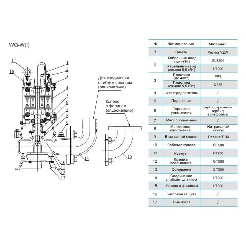 - Рабочее колесо: с режущим механизмом, чугун QT500.